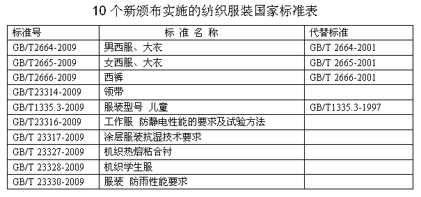 在10項國標中有6項標準為新制定的標準,4項標準為修訂標準。其中《服裝防雨性能要求》、《涂層服裝抗濕技術要求》、《工作服防靜電性能的要求及試驗方法》、《機織熱熔粘合襯》、《機織學生服》為首次發布。《領帶》技術內容經過修訂后,從行業標準上升為國家標準。