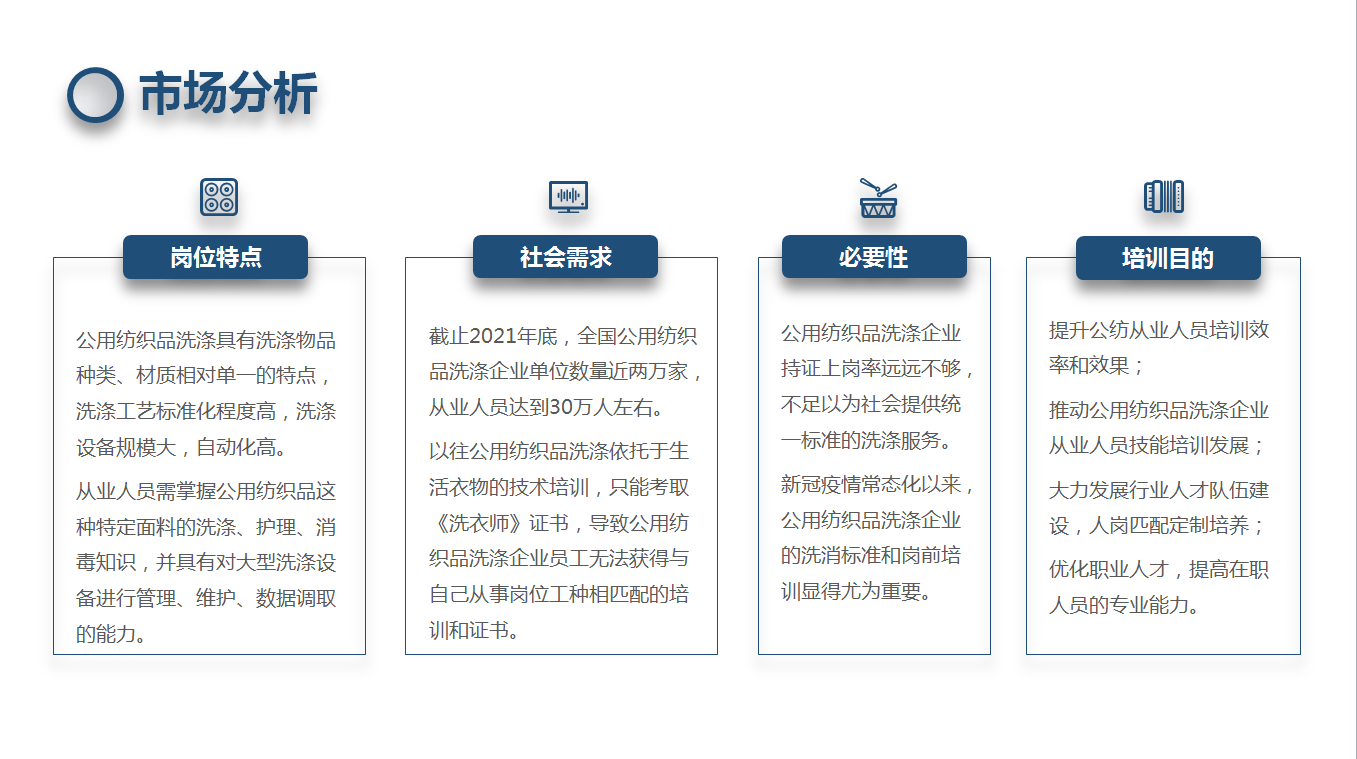 公紡洗護師培訓,將為這一領域的人才培訓和選拔,以及企業在招投標中展示企業從業人員業務能力,發揮重要作用。將彌補該領域專業化培訓的空缺,提升公紡從業人員培訓效率,推動公用紡織品洗滌企業人才專業能力的提升,解決人才流動性大,培訓不系統、持證率低的行業困擾。實現人崗匹配定制培養,推動洗染行業的健康、持續、穩步發展。