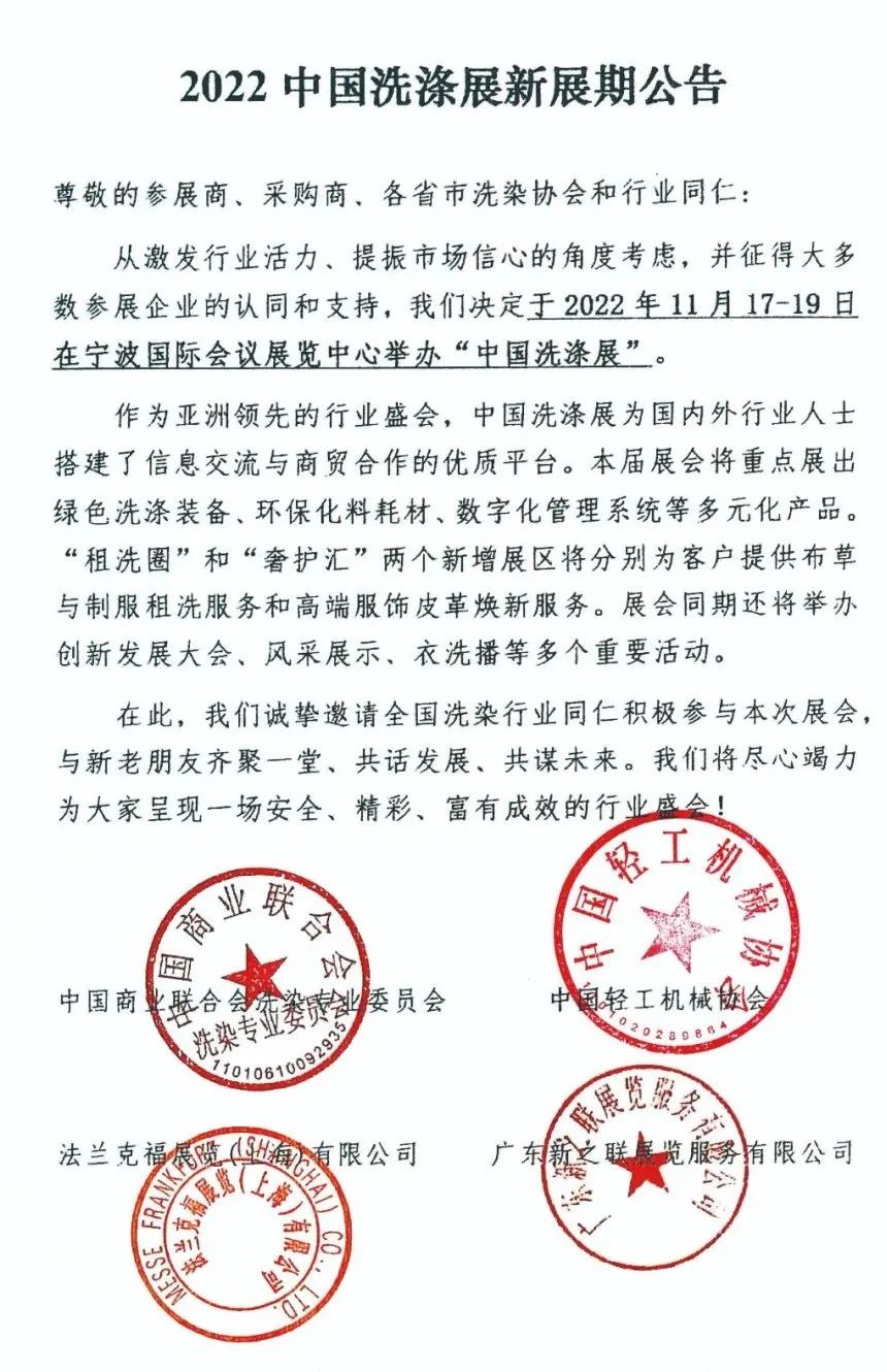 “2022中國洗滌展”定于11月17-19日在寧波國際展覽中心舉行。由中國商業聯合會洗染專業委員會、中國輕工機械協會、法蘭克福展覽(上海)有限公司和廣東新之聯展覽服務有限公司聯合主辦的“中國洗滌展”,已成為行業發展情況的晴雨表,展示著洗染行業的最新發展與變化,滿足著洗染企業運營提升的需求。